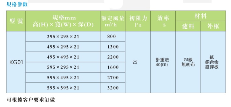 初效過濾器有板式、折疊式、袋式三種樣式,外框材料有紙框、鋁框、鍍鋅鐵框,過濾材料有無紡布、尼龍網(wǎng)、活性碳濾材、金屬孔網(wǎng)等,防護網(wǎng)有雙面噴塑鐵絲網(wǎng)和雙面鍍鋅鐵絲網(wǎng)。G系列粗效